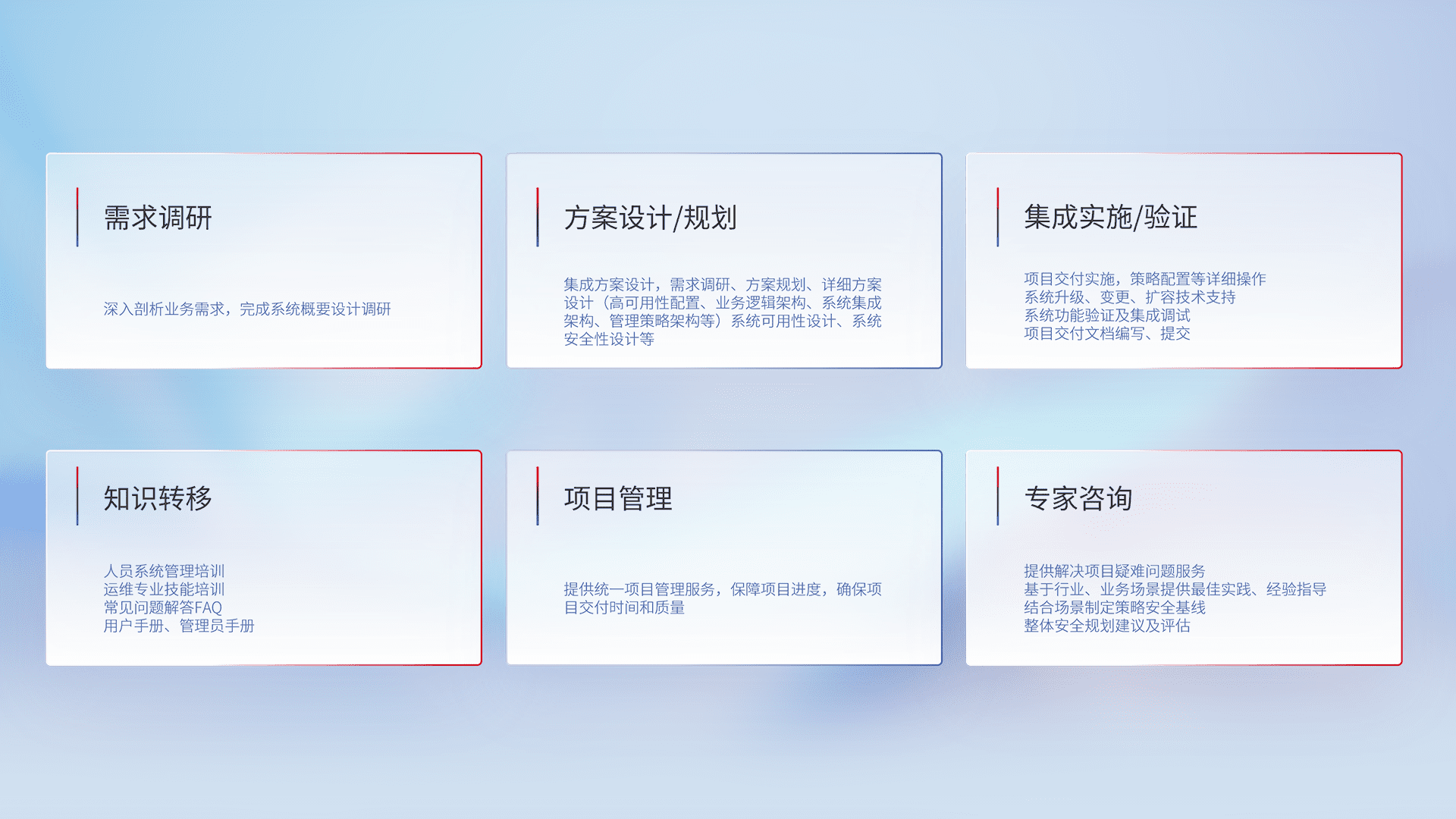 针对客户行业特性,,,将宏观的安全战略和需求,,通过专业的交付服务,,,,实现项目落地,,,,为客户提供标准规范的集成交付服务。。。